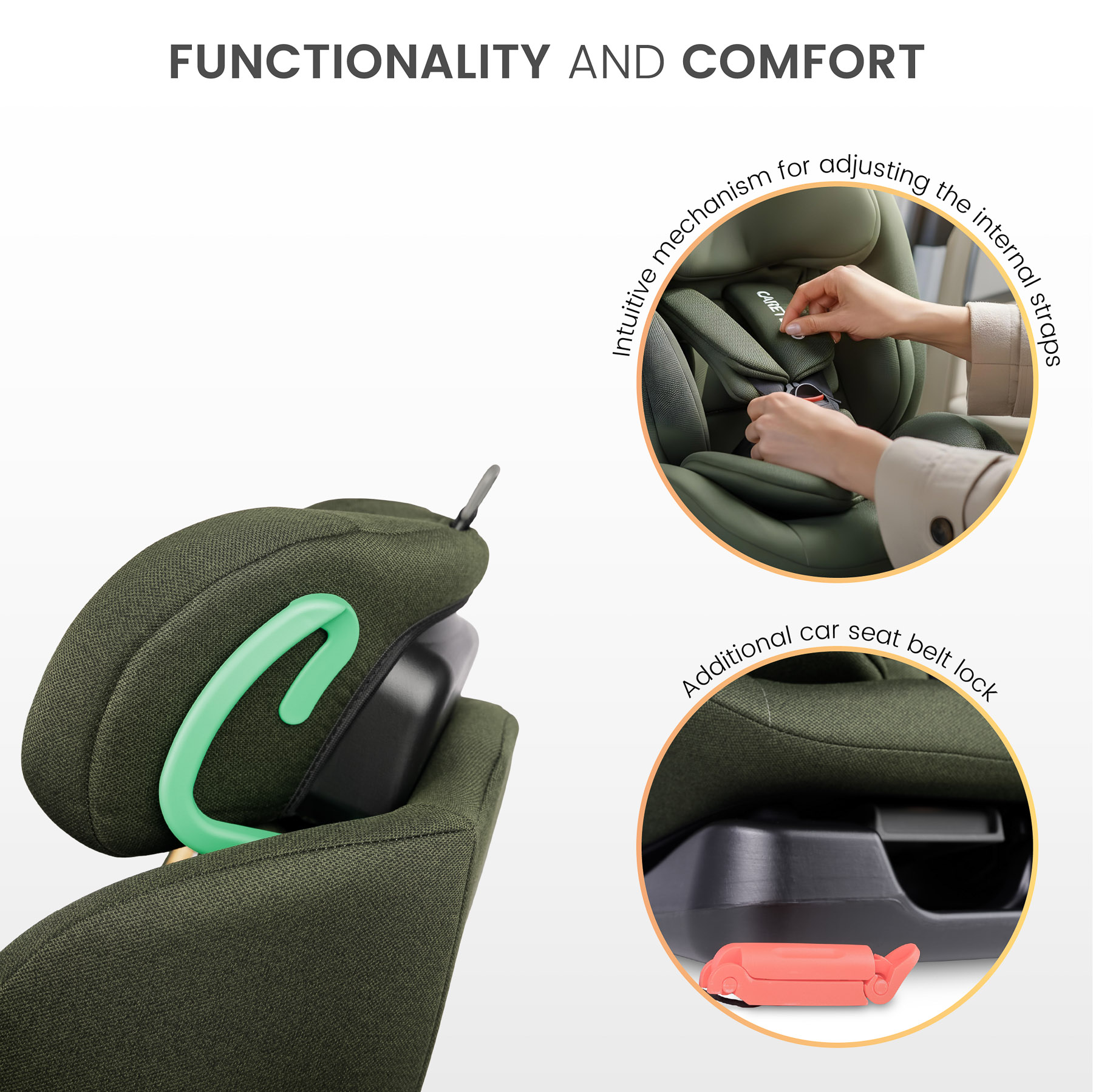 Functionality and comfort The soft seat and delicate fabric ensure your child’s comfort on every journey. Belt guides make it easy to secure and install the seat correctly. The internal belt adjustment mechanism allows you to adjust the belts to your child’s height with one hand – quickly and effortlessly. An additional belt lock provides even greater safety and stability. Although its use is optional, it helps ensure the vehicle’s belt is properly tensioned, ensuring the seat remains stable even on longer journeys.