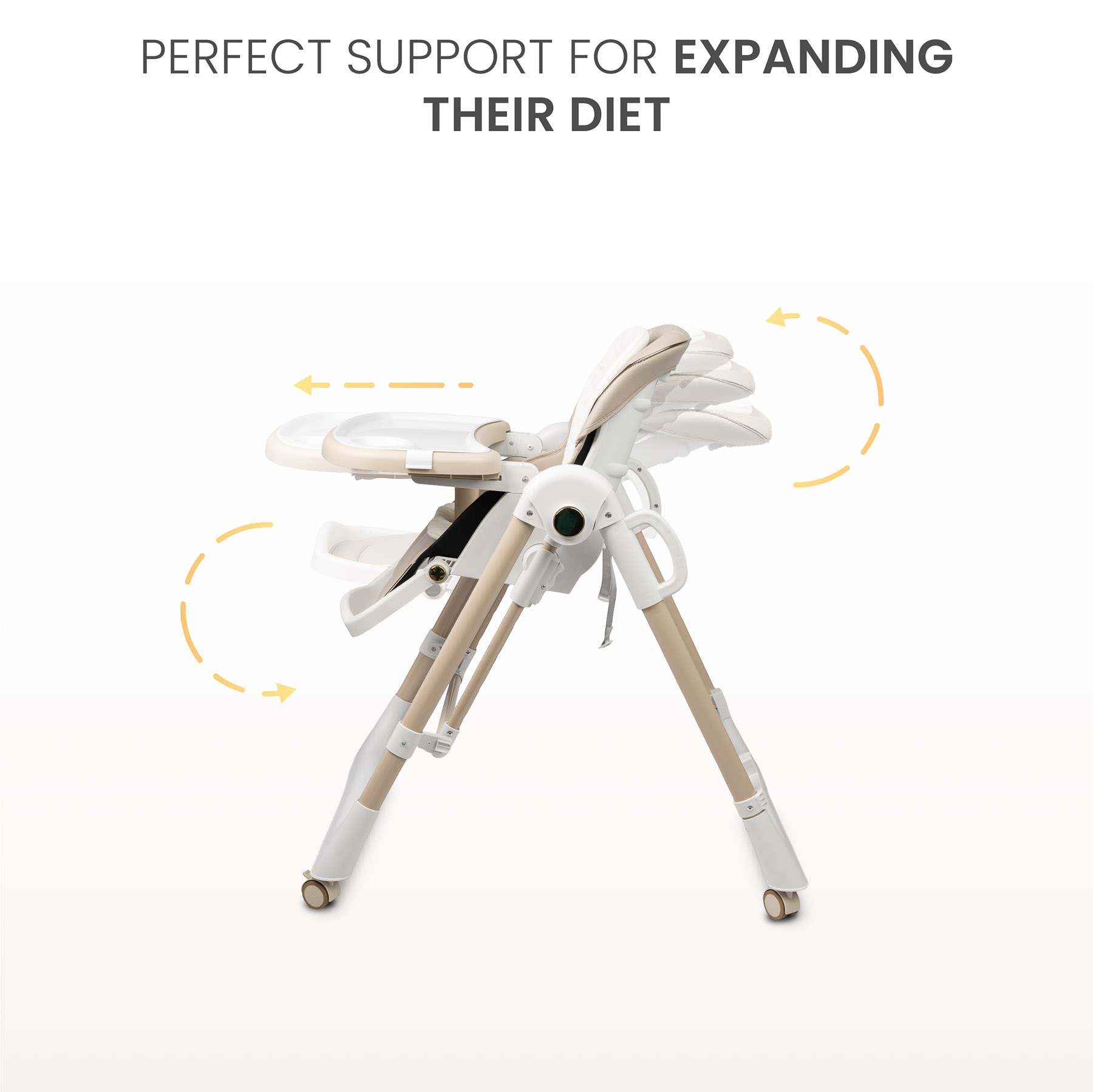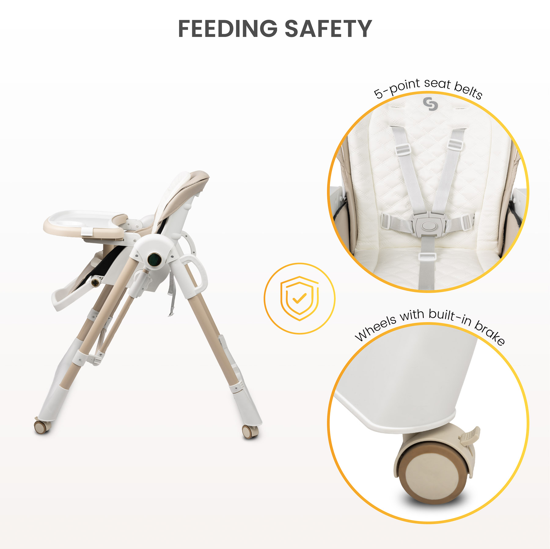Feeding safety The highchair is equipped with a 5-point safety harness that effectively secures your child during every meal. Locking wheels allow for easy movement and when stopped, securely lock the chair in place.