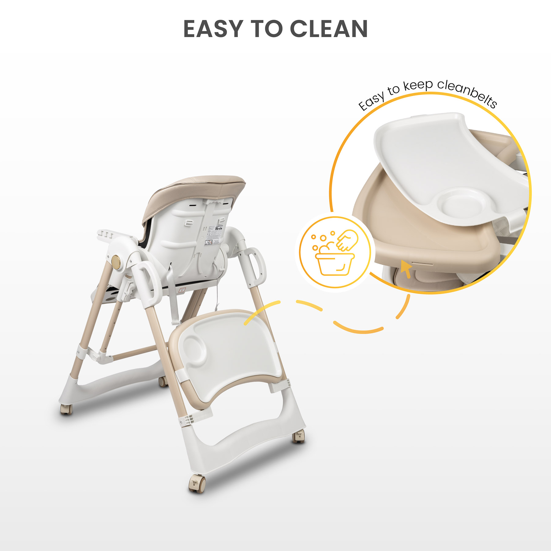 Easy to clean The eco-leather upholstery ensures comfort and easy cleaning – simply wipe the surface with a damp cloth to remove everyday stains. The chair is equipped with an additional soft cushion, providing ideal support and comfort during every meal. The removable top layer of the tray, which can be quickly removed and thoroughly washed, is ideal for maintaining hygiene after every meal.
