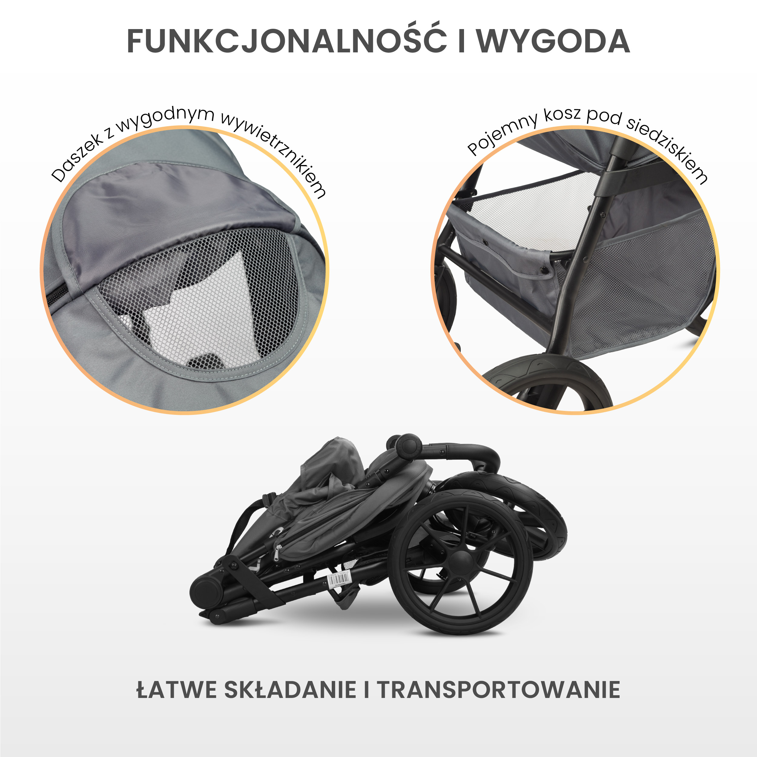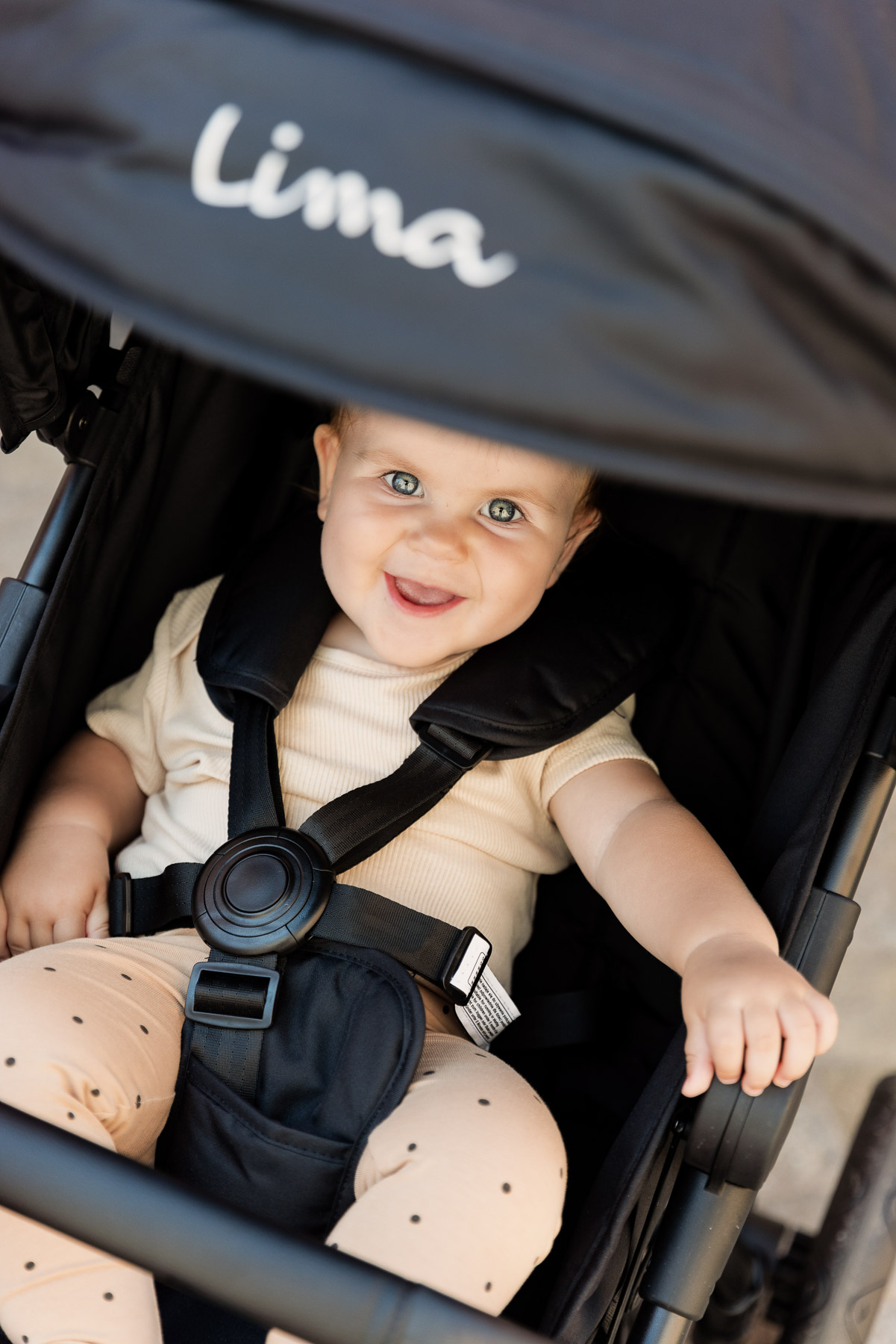 Składanie wózka Lima jest bardzo łatwe w obsłudze, dzięki czemu transport wózka nie będzie problemem. Kosz zamontowany pod siedziskiem pomieści wiele potrzebnych akcesoriów, a daszek wyposażony w wywietrznik zapewnia wygodę małego pasażera.