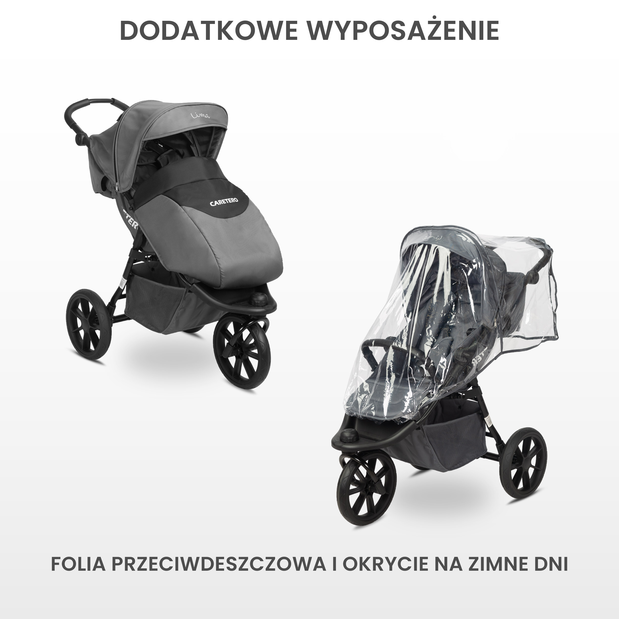 W zestawie z wózkiem Lima znajdują się folia przeciwdeszczowa oraz okrycie na nogi dziecka, które udogodnią spacery niezależnie od pogody.