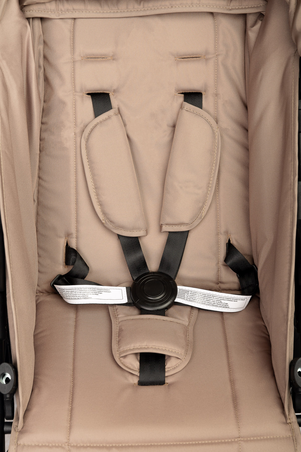 Regulowane 5-punktowe pasy bezpieczeństwa zapewniają ochronę dziecka w trakcie jazdy. Hamulec nożny umieszczony pomiędzy tylnymi kołami zwiększa poziom bezpieczeństwa gdy wystąpi potrzeba zatrzymania się.